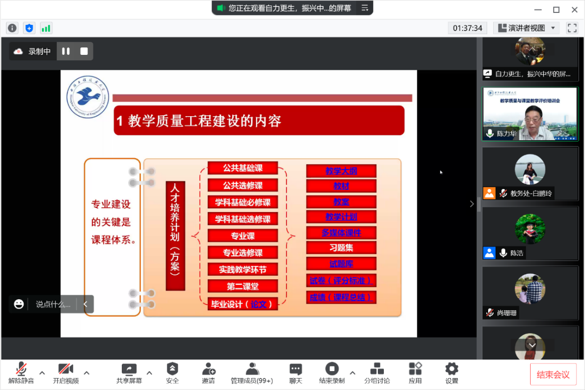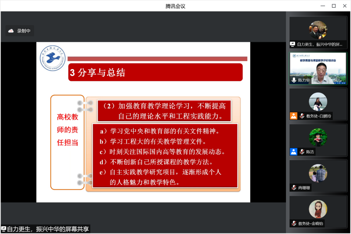 陈力华教授在全面总结近三年我校教学督导工作所取得的成绩以及全校教育教学质量逐步提高的基础上,对教学质量工程建设的内涵和课堂教学质量评价相关内容做了详细介绍和分析,对教育部本科教学相关文件进行了梳理,通过典型教学案例展示强调了教学大纲、教材、教案、多媒体课件等教学资料规范的重要性,并结合教学督导经历对老师们在课堂教学中如何实现价值引领,融入课程思政,做好教学准备、教学内容、课堂秩序等进行了指导,使老师们认识到要将质量意识贯穿于教学各个环节,在思想上和行动上要牢固树立教书育人的核心是立德树人的理念,为培养中国特色社会主义事业的建设者和接班人打造卓越的工程大教学质量文化是每位教师应尽的责任。此外,陈教授还分享了自己在工程大当教师40多年的体会,并对高校教师的责任担当进行总结和分享。陈教授认为,党中央提出中国特色社会主义大学要培养德、智、体、美、劳全面发展的新时代大学生,作为大学老师就要从我做起,不论是工科、文科、理科、管理还是艺术学科的老师,善于欣赏高雅艺术,爱好体育运动,热爱生活中的琴棋书画都是当好一名老师的充分条件。最后,陈教授把自己在上海高校校长合唱艺术高级研修班学到的歌唱艺术,制作成MV 视频,配以督导工作和生活照片,分享给在线的老师们,使线上人气急剧上升,获得了老师们的共鸣!