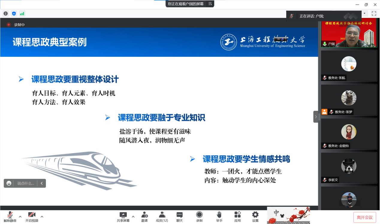 会上,城市轨道交通学院户国老师作了题为《城市轨道交通课程思政指南经验分享》的主题发言,从学院、专业、教师三个层面详细介绍了轨道交通课程思政建设的规划与设想。并以“城市轨道交通列车网络控制技术”课程为例,分享了思政教学设计和课程思政教学指南编写思路”。