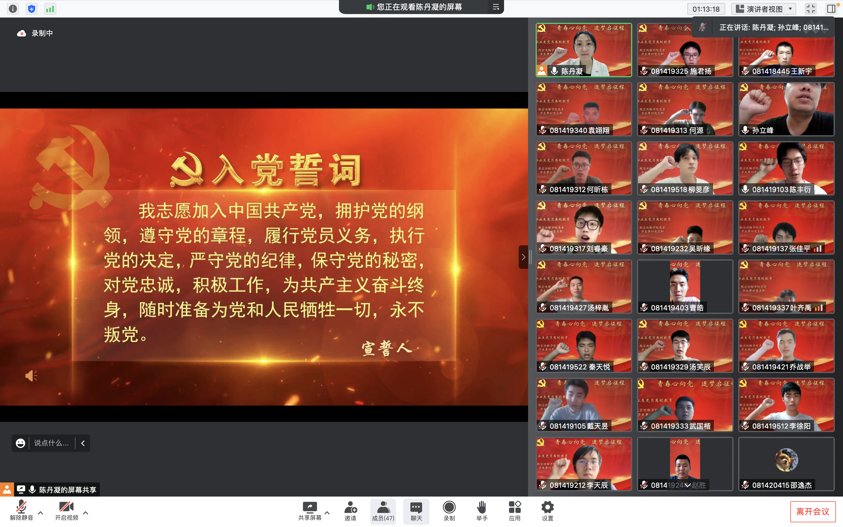 最后,支部书记陈丹凝老师带领所有党员同志重温入党誓词,举起右拳,庄严宣誓。铿锵有力的誓词,激励着党员同志,永葆入党初心,强化党员意识,增强组织观念和纪律观念,任何时候冲锋在前,不懈奋斗。