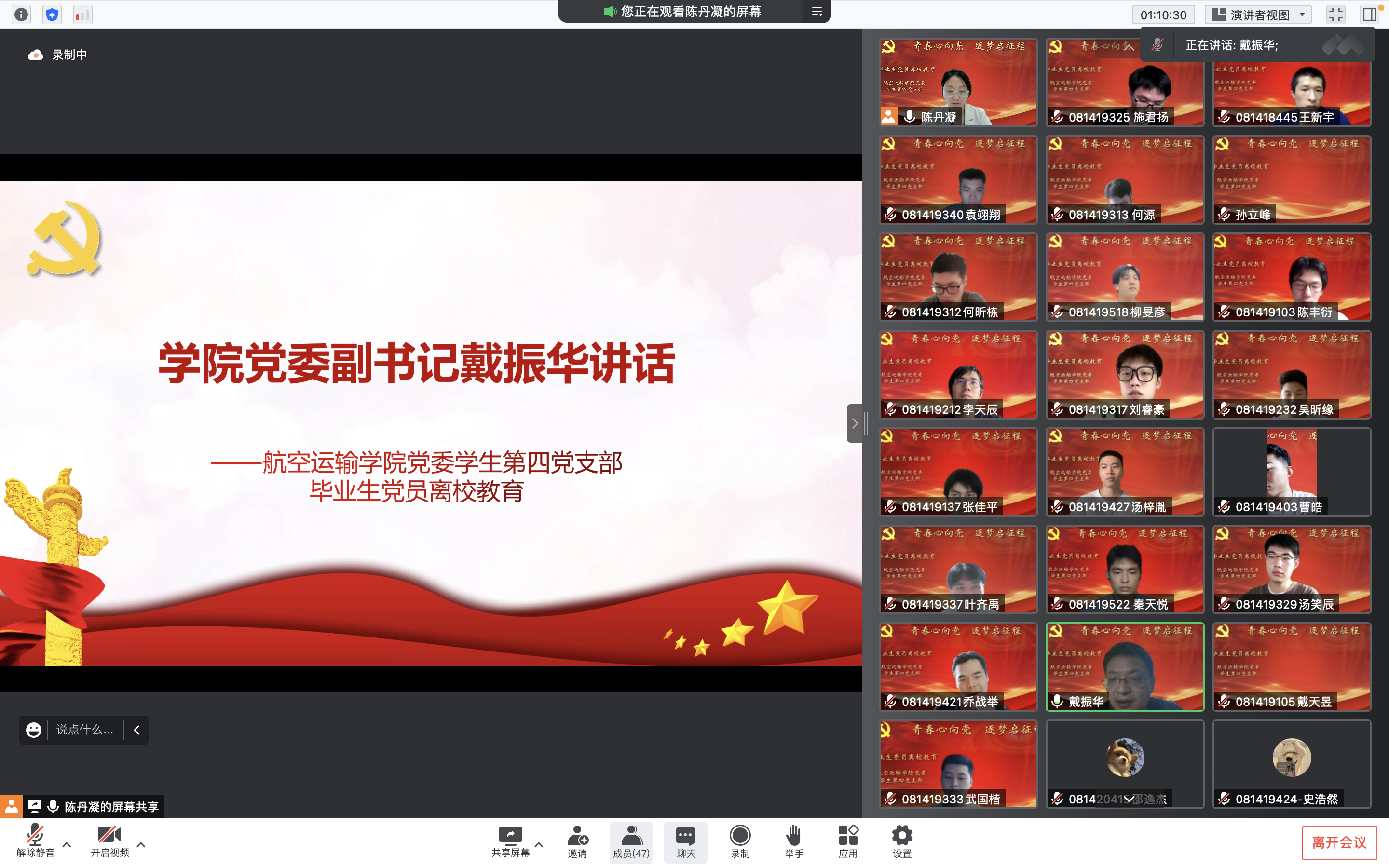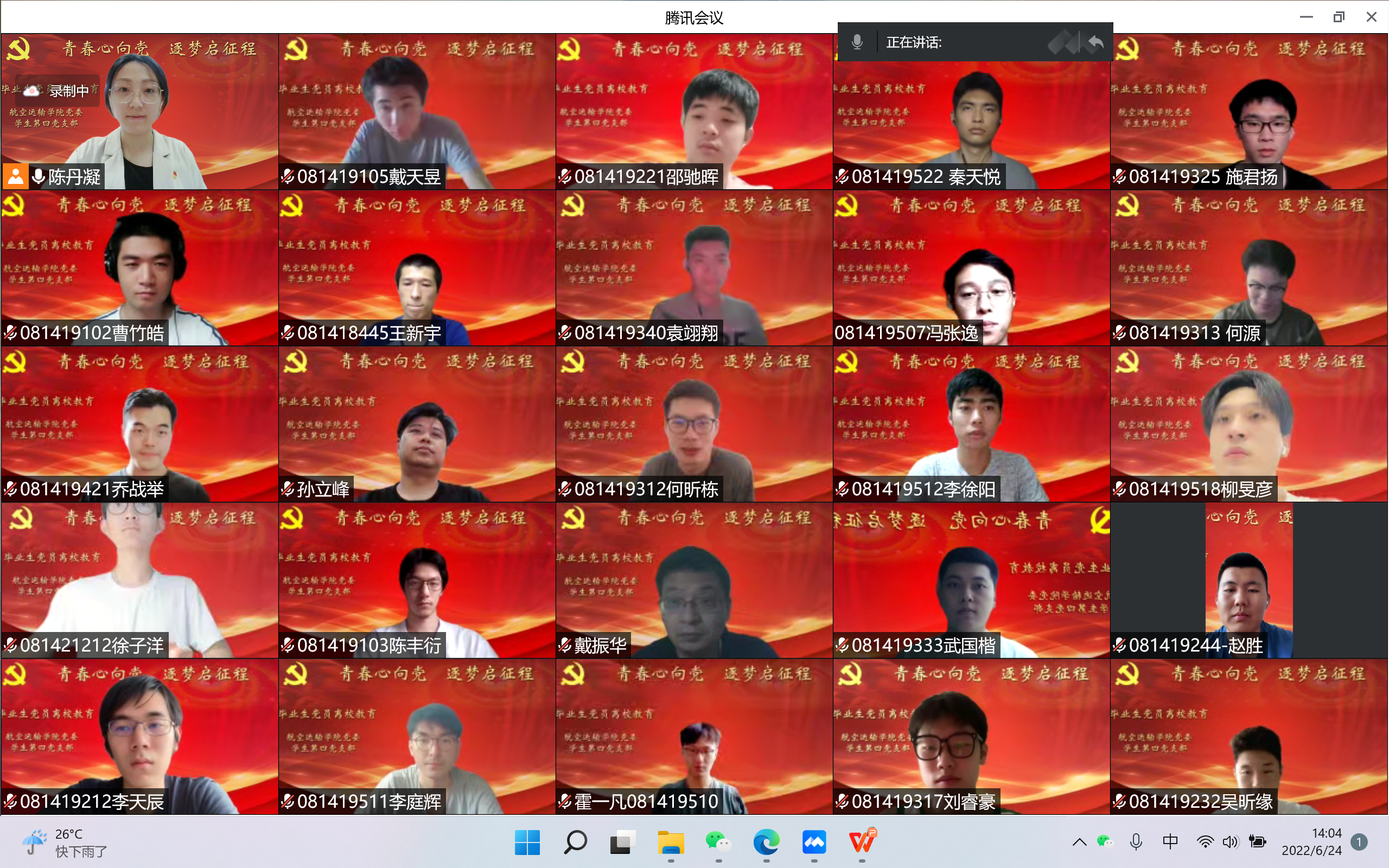 6月24日,航空运输学院党委学生第四党支部通过腾讯会议开展主题为“青春心向党,逐梦启征程”毕业生党员离校教育。支部书记陈丹凝主持活动,支部全体师生党员参加活动。
