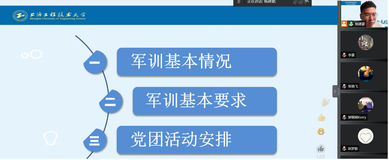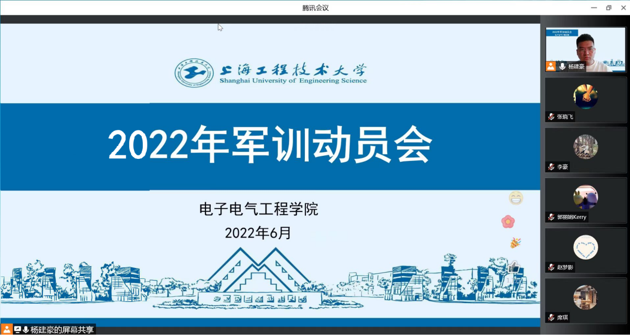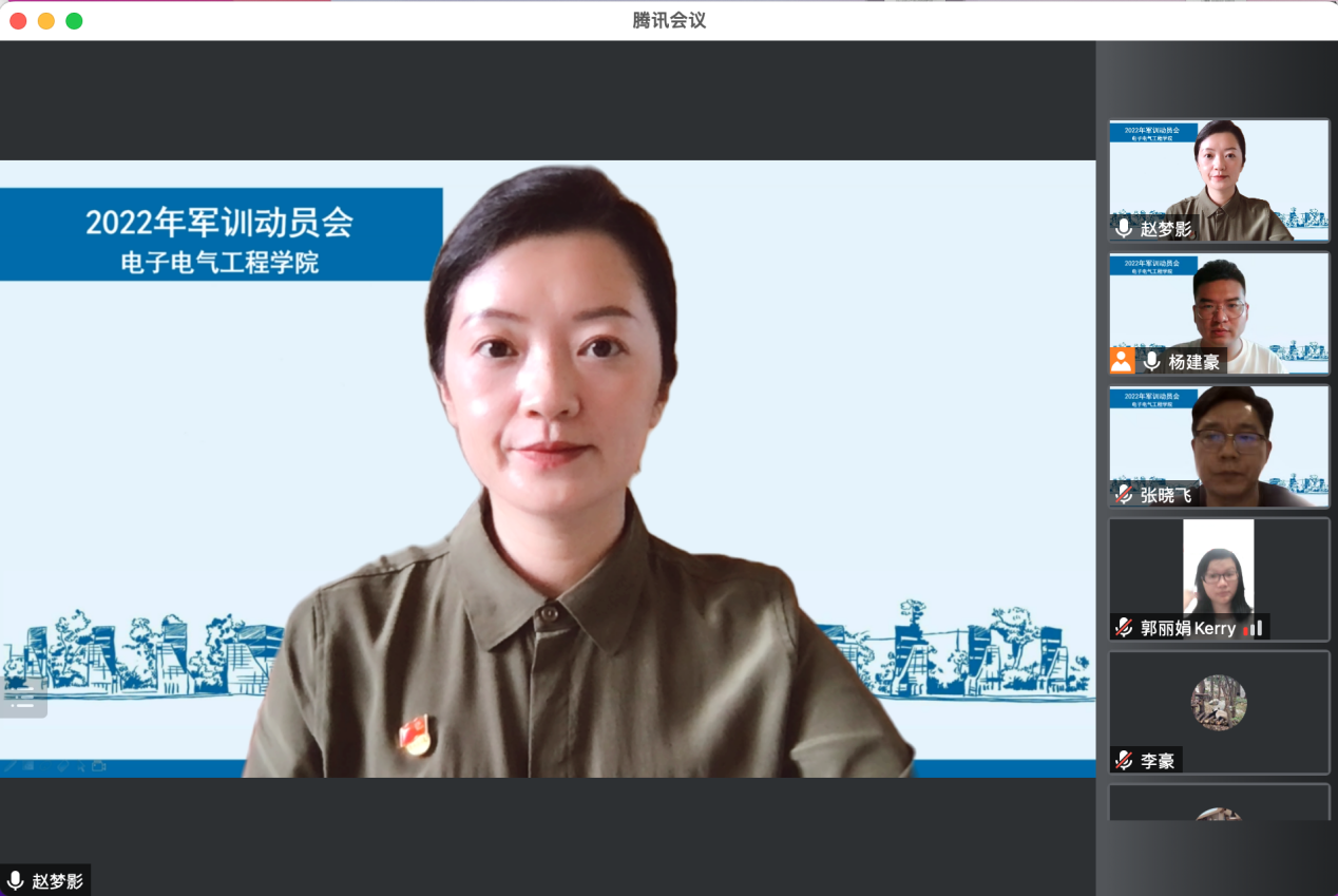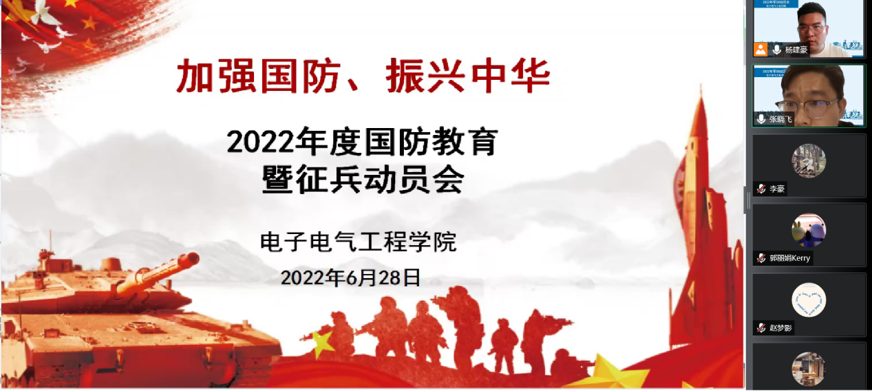 吹响青春集结号,砥砺奋进新征程。为了全面贯彻《中华人民共和国国防教育法》,落实国家国防教育的相关要求,全力做好2022年军事训练工作,6月28日下午,电子电气工程学院召开2022年军训动员大会。学院党委副书记赵梦影、本次军训参训的5名辅导员和全院参训的500余位同学出席会议。由于疫情影响,本次会议通过在线开展,大会由2021级辅导员杨建豪主持。