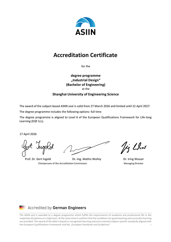 4月17日,德国高等工程教育认证机构ASIIN(German Accreditation Agency for Study Programs in Engineering, Informatics, Natural Sciences and Mathematics)正式通知,上海工程技术大学艺术设计学院工业设计专业成功通过ASIIN专业认证,认证有效期自2026年3月27日起。该专业成为全国首个通过德国ASIIN认证的工业设计专业,标志着我校专业建设与国际化办学取得突破性成果。