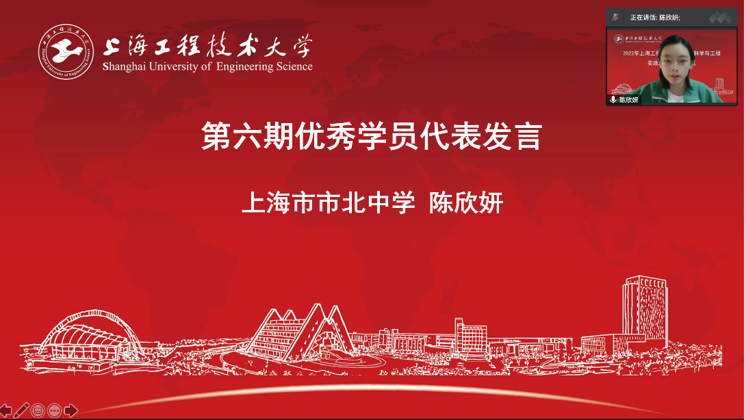 来自上海市市北中学的陈欣妍同学,作为第六期优秀学员代表发言。她介绍了自己在工作站的学习经历,分享自己的学习心得,她说:“兴趣是最好的老师”。讲述了自己如何在学习的过程中克服重重困难,她期待每一位参加纺织科学与工程实践工作站的学员都能有丰硕的成果和体会。
