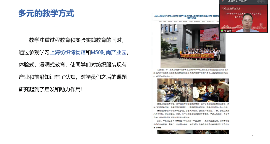 7月7日,纺织科学与工程实践工作站第七期课程在云端开班。校团委书记董旖旎,纺织科学与工程实践工作站站长辛斌杰,纺织科学与工程实践工作站副站长、纺织服装学院党委副书记谢志霞,工作站各课题指导教师、实践点负责人、第六期优秀学员代表、以及第七期全体学员共同参加会议。会议由纺织科学与工程实践工作站副站长、纺织服装学院党委副书记谢志霞主持。