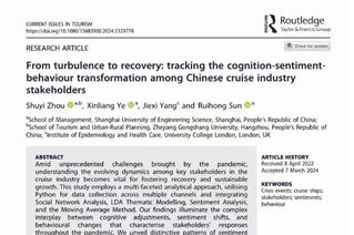 近日,管理学院孙瑞红副教授(通讯作者)指导2020级旅游管理方向研究生周淑怡(第一作者)与国际学者等共同在旅游类SSCI期刊《Current Issues in Tourism》(Q1,IF=8.0)上发表了题为From Turbulence to Recovery: Tracking the Cognition-Sentiment-Behavior Transformation among Chinese Cruise Industry Stakeholders(《从低谷到重启:追踪中国邮轮行业利益相关者认知-情感-行为转变》)的高水平论文。该研究综合运用社交网络分析、LDA主题建模、情感分析和移动平滑法,阐明了邮轮利益主体(政府,邮轮公司,邮轮旅游者以及潜在邮轮旅游者)的认知调整、情绪转变和行为变化之间复杂的相互作用。该研究强调了政府和邮轮公司在引领行业复兴方面的关键作用,强调了他们在塑造积极情绪和积极参与行业增长方面的影响力。此外,研究还揭示了潜在游客对外部不利事件的脆弱性,影响了他们对邮轮旅游的看法和潜在参与。通过深入研究这些多方面的动态,本研究有助于更深入地理解以利益相关者为