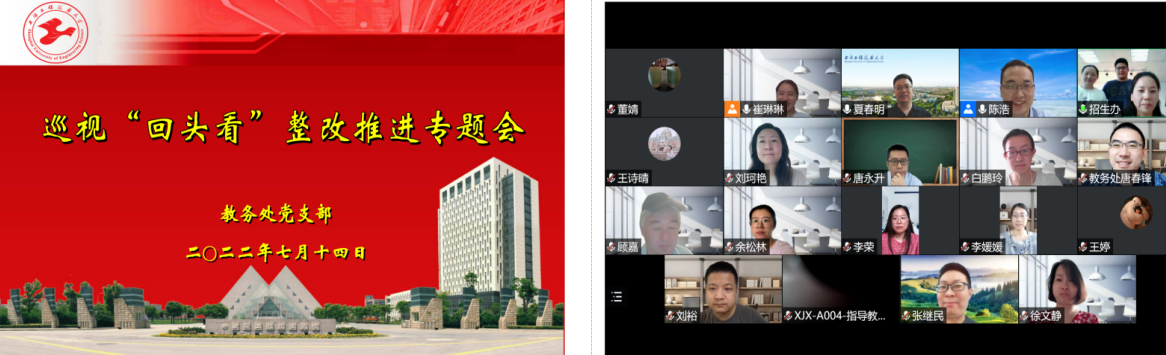 7月14日上午,教务处党支部在线召开巡视“回头看”整改推进专题会,教务处党支部全体党员参会,夏春明副校长作为支部普通党员参会,会议由支部书记陈浩主持。