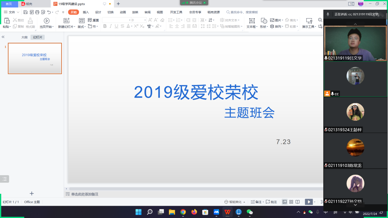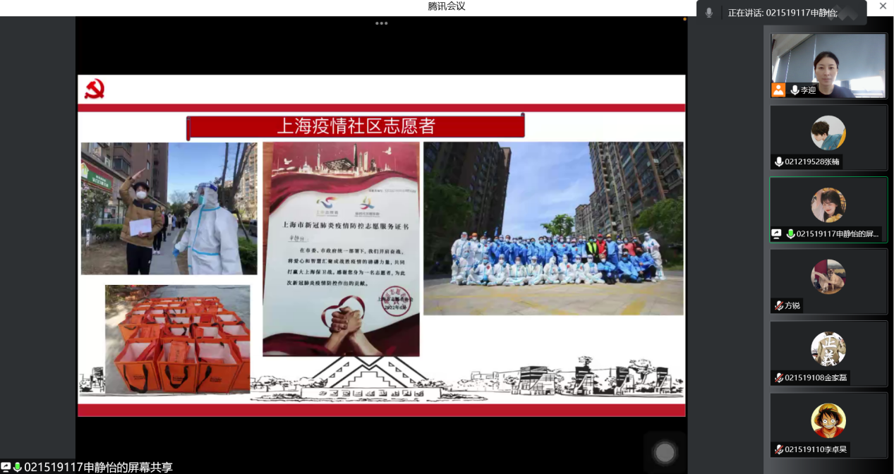 2019级主题班会邀请了自动化专业的张楠同学和广播电视工程专业的申静怡同学,从抗疫难忘故事、暑期计划安排、实习提升自我、考研备战复习等角度进行经验分享。张楠同学讲到,本学期疫情期间,班级同学们团结互助、共克时艰,积极参加并配合疫情防控工作,荣获“最美抗疫班级”。建议大家充分利用暑期时间,制作简历找实习、进行考研和考公备战等。申静怡同学讲述了参加进博会志愿服务、疫情期间参加社区志愿服务以及目前正在进行的实习,这一路的历程让自己从思想觉悟到实践能力都得到极大提升。特别是现在,从象牙塔走上实习岗位,其中的个人角色和思维方式发生了很大变化,同时开阔了眼界,为后续真正选择就业岗位积累了经验。