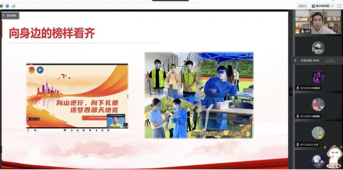 展爱校情怀,担荣校使命。2021级研究生主题班会中,辅导员表扬和感谢了研究生二年级党员和志愿者们在疫情期间的辛勤付出,他们用自己的实际行动表达了爱国爱校之情。提出作为新时代青年,应该怀揣一颗爱国的心,肩负使命,行动起来,用所学的知识为祖国服务、为人民服务。