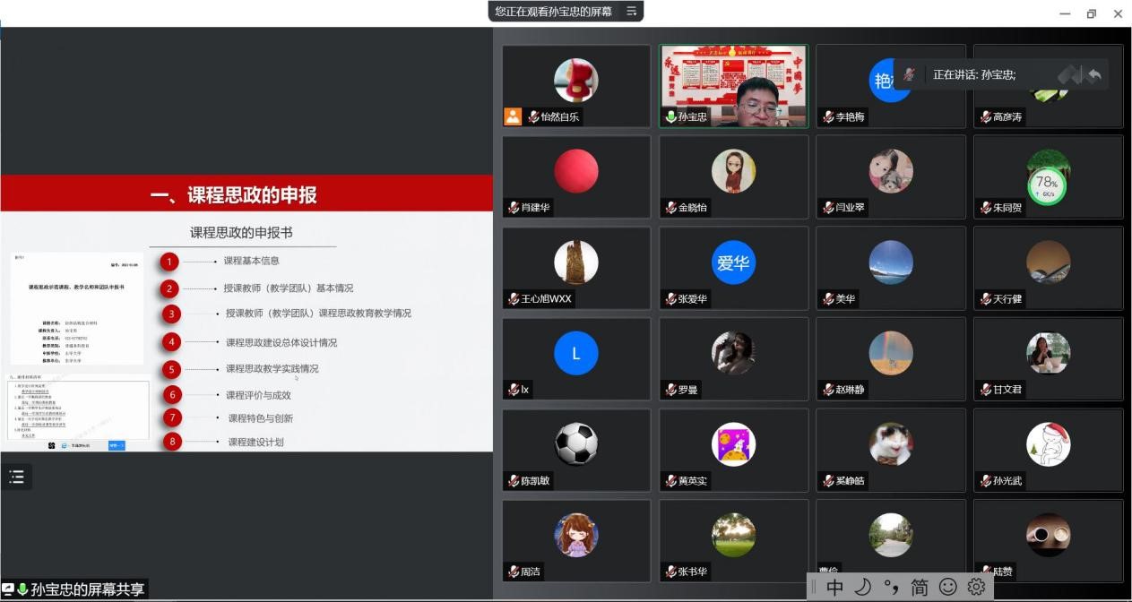 7月27日,召开“国家课程思政示范课程经验分享交流会”,邀请东华大学获得国家级课程思政示范课程的孙宝忠教授做经验分享,会议与教务处共同组织。教务处副处长金晓怡、在建的课程思政建设项目团队和相关老师参会,会议由研究生处副处长李艳梅主持。孙宝忠教授是教育部课程思政教学名师、上海市课程思政领航团队负责人、首批高校“双带头人”教师党支部书记工作室负责人、首批全国党建工作样板支部党支部书记。会上,孙宝忠教授从课程思政的申报、课程思政的认知、课程思政的顶层设计、课程思政领航学院构建与实践、四位一体的课程思政体系构建与实践、纺织结构复合材料课程思政案例、课程思政建设的问题思考七个方面展开介绍,就课程思政的建设、课程思政元素与课程教学的有机融合、课程思政示范项目的申报等分享了诸多经验和做法,参会的老师们都表示受益匪浅。