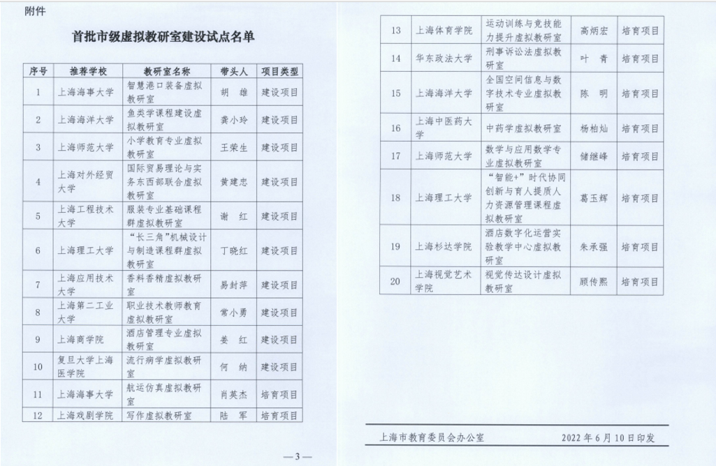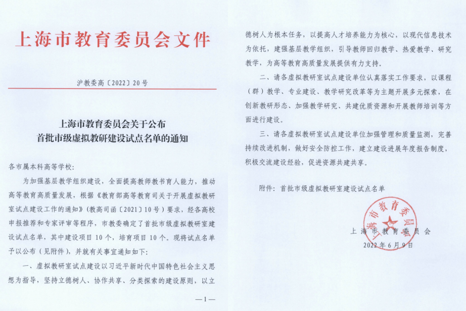 “服装专业基础课程群虚拟教研室”是以纺织服装学院实体教研室课程资源为基础,依托现代信息技术与“长三角G60科创走廊高水平应用型高校协同创新联盟”构建的,以服装专业基础课程群为特色的虚拟教研活动平台,2022年6月获批上海市教委首批市级虚拟教研室建设试点单位。