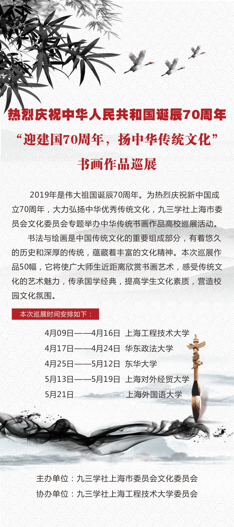 为热烈庆祝新中国成立70周年,大力弘扬中华优秀传统文化,由九三学社上海市委员会文化委员会举办的 “迎建国70周年,扬中华传统文化”中华传统书画作品高校巡展在我校拉开序幕。九三学社工程大委员会和其他四所高校积极承办,我校是巡展第一站。