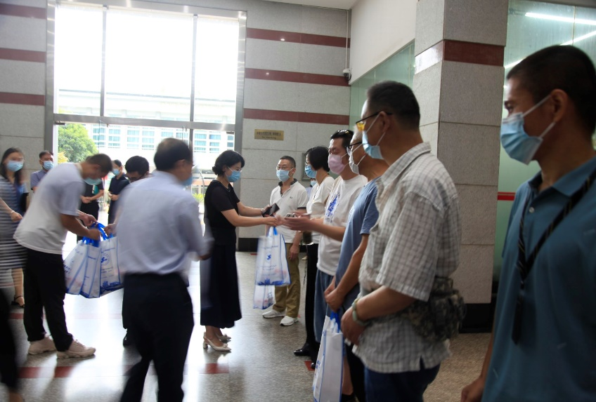 8月26日上午,校党委副书记、副校长朱晓青在党办副主任王成涛,高职学院、高级技校党政领导的陪同下,慰问虹口校区暑假期间坚守岗位的在岗教职工,为他们送上暖心关怀。