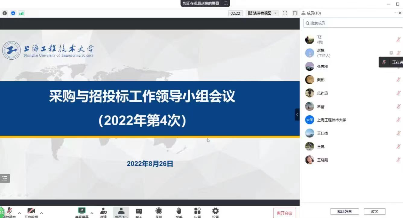 8月26日,学校在线召开采购与招投标工作领导小组会议(2022年第4次),采购与招投标工作领导小组成员参加会议。会议由王岩松副校长主持。
