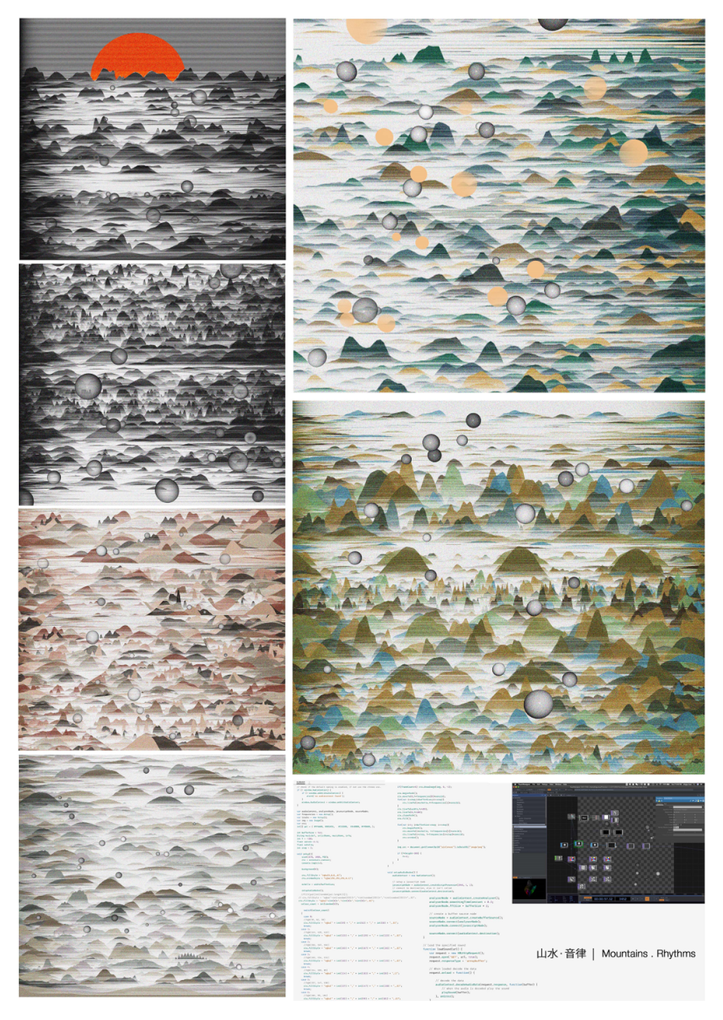 罗婧予老师的作品《山水音律》收获教师组全国一等奖,该作品以中国山水画为灵感,用Pjs语言编程,借用通感手法,将《春江花月夜》《渔舟唱晚》《高山流水》等古典筝曲视觉化,生成出中国传统的山水画长轴。古筝之气韵,转译为山水之意蕴,山水画面延绵不绝,山峦叠嶂,云遮雾连,随着旋律节奏的缓急变化,时而清远,时而厚重。画面中漂浮着的小球,穿插在山水之中,更为画面增添了一丝灵动的气息,浮动的小球用TouchDesigner软件设计生成。