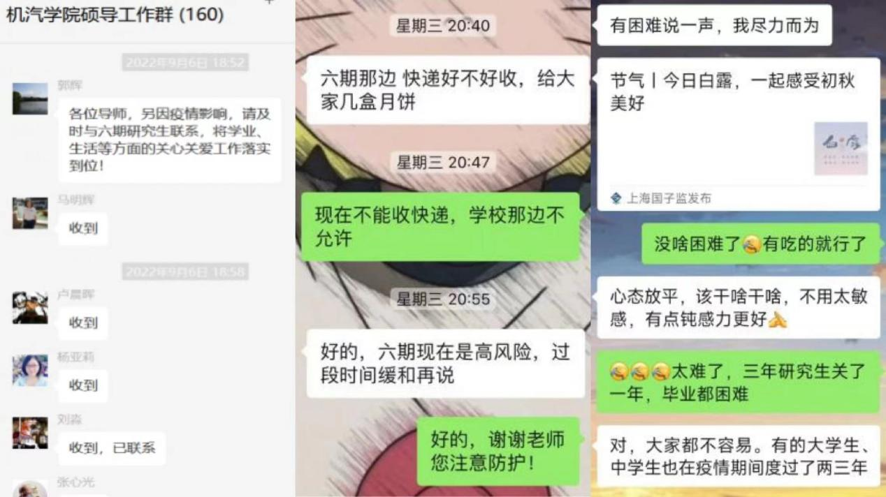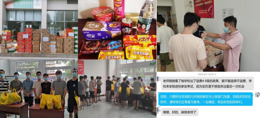据悉,学院党政根据六期学生的实际需求和困难,第一时间由学院领导、辅导员、住楼辅导员、学生骨干组成保障小组,迅速调集人力、物力,协调划拨经费为学生采购急需的生活日用品和食品,联系后勤车辆及时把慰问物资送到学生手中,切实解决了同学们的燃眉之急,让同学们体会到了学院的关爱和温暖。在六期列为高风险当天,学院选派一名骨干辅导员驻守六期宿舍,与学生同吃同住,第一时间现场处置学生遇到的各类问题,及时疏导和安抚学生心理,为学生提供24小时全天候贴心服务。学院积极组织所有导师主动电话或信息关心带教学生,加强对学生的关心关爱,鼓励并指导学生继续做好科研工作,云端话学术,科研不停步。