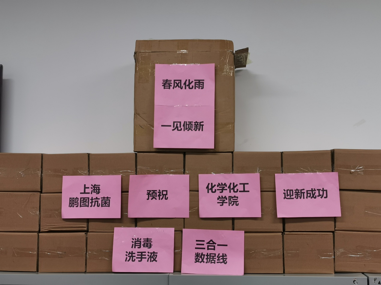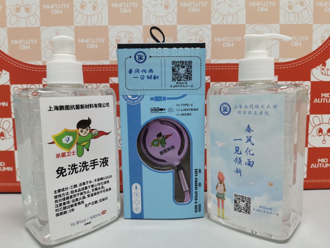 张栋栋校友赠送的新生礼品包含免洗洗手液500份、数据线700份。其中免洗洗手液为张栋栋校友所在单位上海鹏图抗菌新材料有限公司的产品。张栋栋校友目前在该单位担任技术服务总监一职。