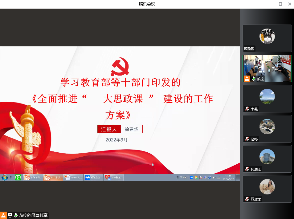 9月15日下午,航空运输学院党委中心组在航飞楼6423和腾讯会议举行线上线下扩大会议,专题学习教育部等十部门联合印发的《全面推进“大思政课”建设的工作方案》(简称《工作方案》),会议由学院党委书记徐建华同志主持,学院党委委员、工会主席、党政办主任和全体支部书记参加学习。