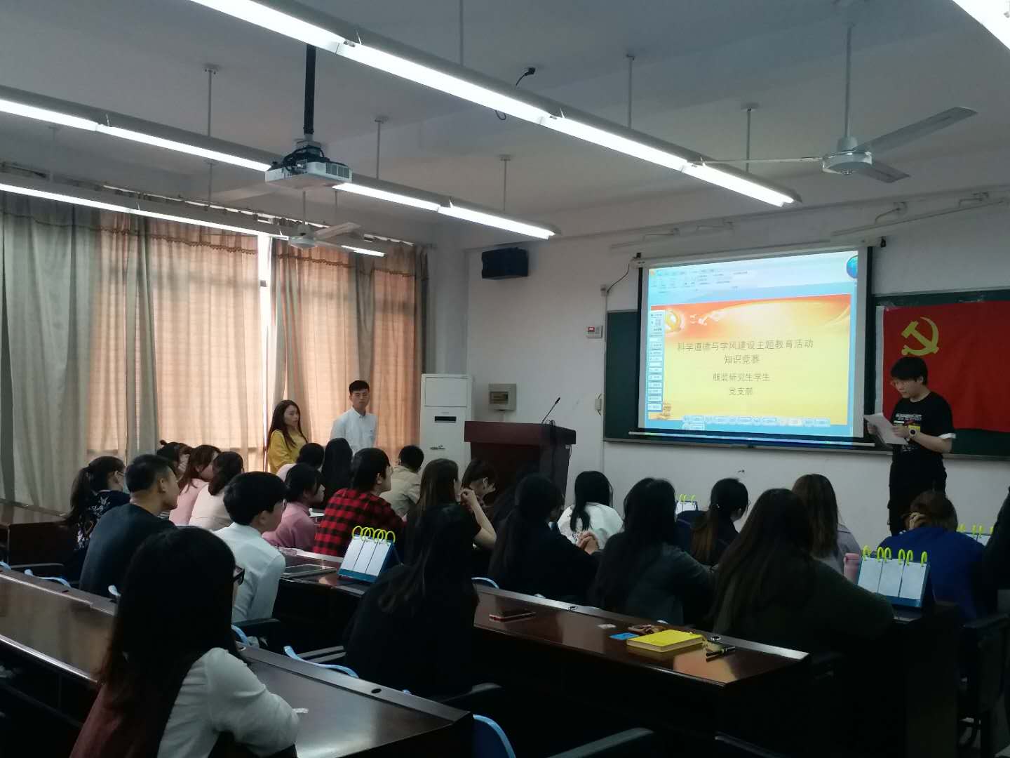 为深入学习贯彻习近平新时代中国特色社会主义思想、党的十九大精神和“科技三会”精神和习近平总书记关于科学道德和学风建设的重要指示精神, 4月24日下午,服装学院在艺术楼C310开展了2019年研究生“科学道德与学风建设”知识竞赛决赛。服装学院党委副书记谢志霞、组织员苌欣、研究生辅导员沈智莉、研究生秘书常文静,以及全体研究生党支部成员参加了此次活动。