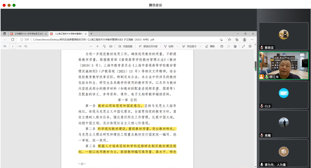 会上,李光安副院长领学了《上海工程技术大学教材管理办法》沪工程教(2022)40号)、《上海工程技术大学研究生教学建设项目经费管理办法(试行)》(沪工程研[2019]46号)、《上海工程技术大学研究生课程思政指南》、关于印发《上海工程技术大学关于各类考核考场规章、违规界定和处分管理规定》的通知、关于印发《上海工程技术大学学籍学历管理工作实施细则》的通知、关于印发《上海工程技术大学研究生分类培养实施方案》的通知以及关于印发《上海工程技术大学研究生教育优质教学资源建设实施方案》的通知等十二个通知,结合学校研究生教育现状和工作实际,进一步明确研究生导师工作职责。