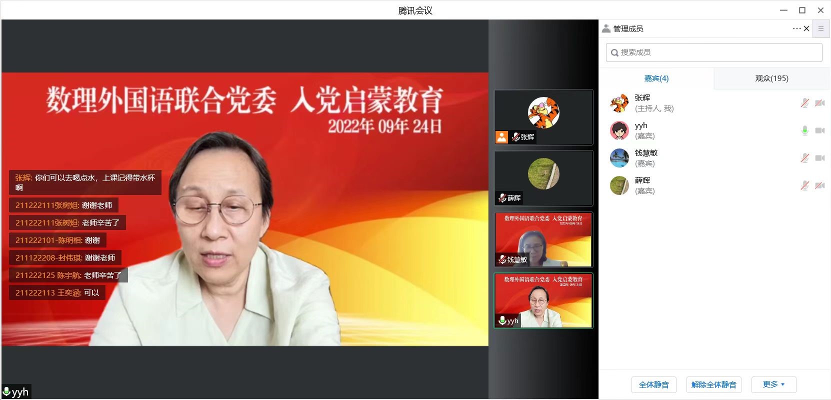 引燃青年学子理想信念“火种”,帮助青年学子知党、信党、入党。9月24日上午,数理外国语联合党委与数理与统计学院、外国语学院2022级新生线上相聚,开展入党启蒙教育。校关工委委员、原机械与汽车工程学院党委书记杨寅华,数理外国语联合党委书记钱慧敏,数理与统计学院院长王国强,新生导师,全体新生参加线上会议。
