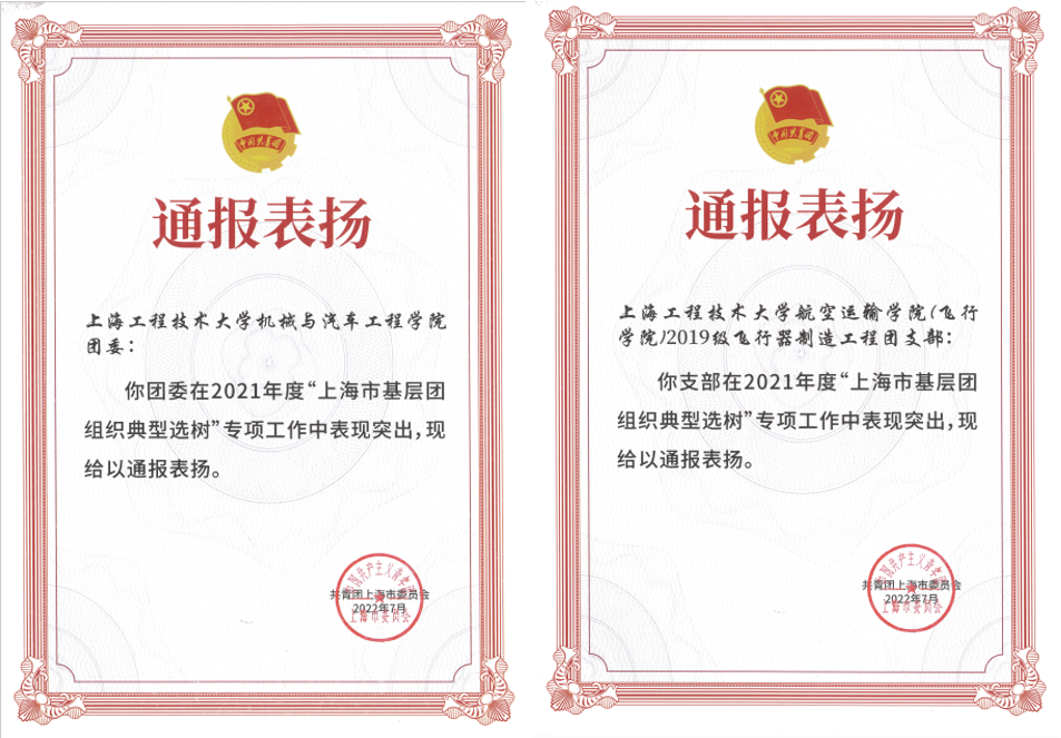 近日,2021年度“上海市基层团组织典型选树”专项工作结果新鲜出炉,我校机械与汽车工程学院团委、航空运输学院(飞行学院)2019级飞行器制造工程团支部在“上海市基层团组织典型选树”专项工作中表现突出,获通报表扬。