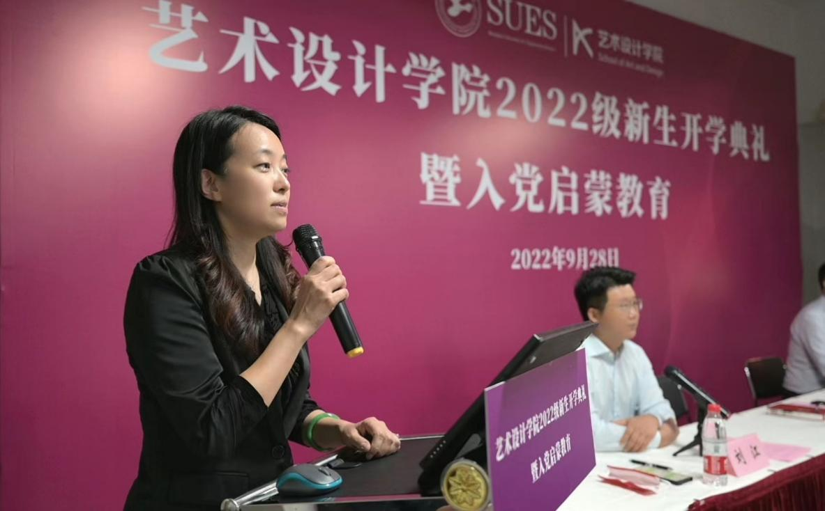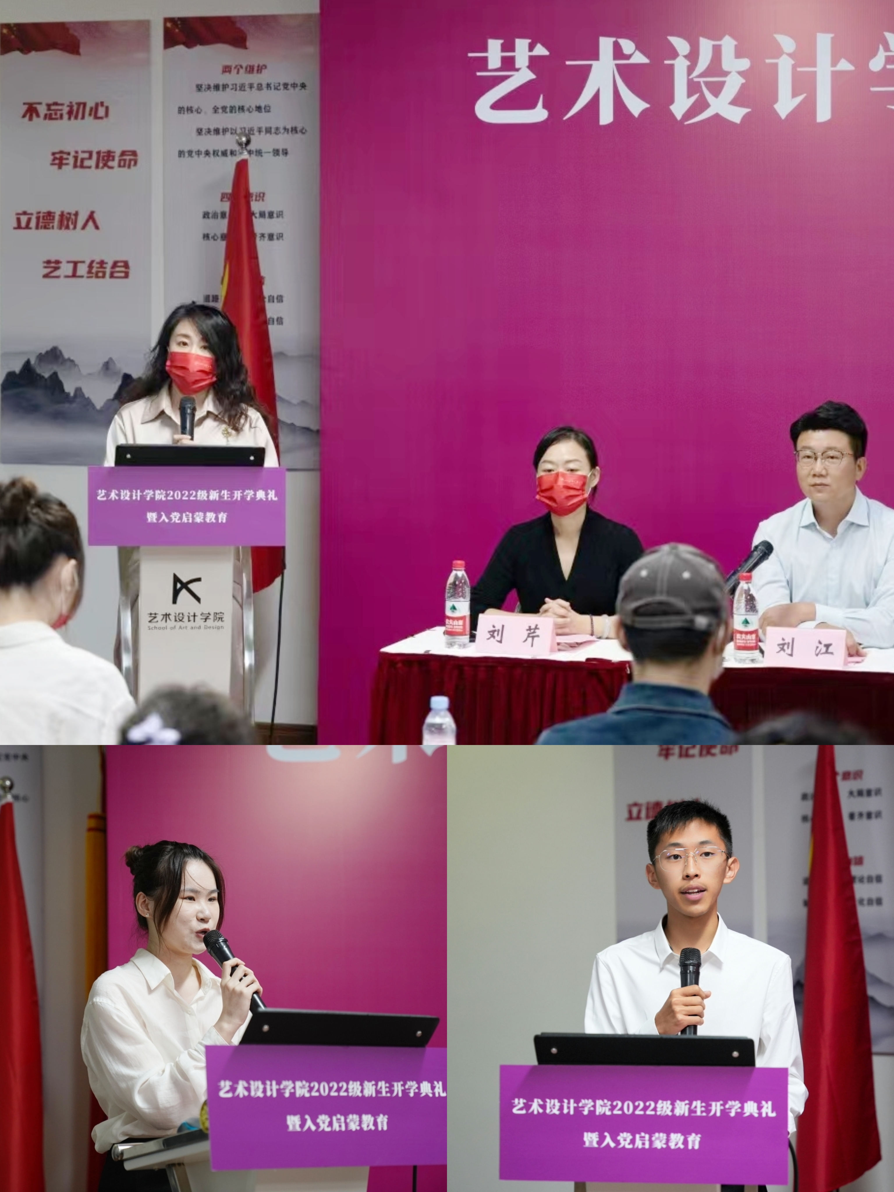 新生开学典礼在庄严的国歌中拉开序幕。学院党委书记袁蓉以《迎二十大,弘扬伟大建党精神;强国有我,在奋斗中梦想成真》为题为新生带来开学第一堂党课。她介绍了艺术设计学院党委的新形势和新任务的时代背景,以及学院党委的建设和发展情况。从“为什么考大学?我的梦想是什么?如何度过四年大学?我的职业生涯在哪里?怎样规划自己的人生?”引入,希望新时代大学生争朝夕、练能力、学做人,成为“想做事、会做事、做成事、好共事、不出事”的德才兼备之才!希望优秀青年们以实际行动争取早日加入党组织,为中华民族伟大复兴而不懈奋斗!