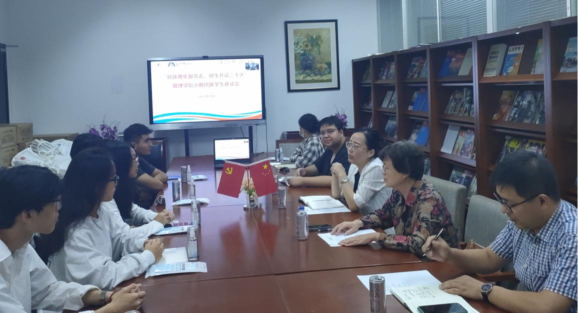 为迎接党的二十大胜利召开,深入贯彻落实中央民族工作会议的精神,进一步了解和关心少数民族学生的学习和生活。9月28日,管理学院召开“民族青年跟党走,师生共话二十大”少数民族学生座谈会。学院党委书记周洁,党委副书记程玉莲、张强,少数民族专职辅导员木合甫力以及学院各年级少数民族学生出席座谈会。会议线上线下同步进行,由少数民族专职辅导员木合甫力主持。