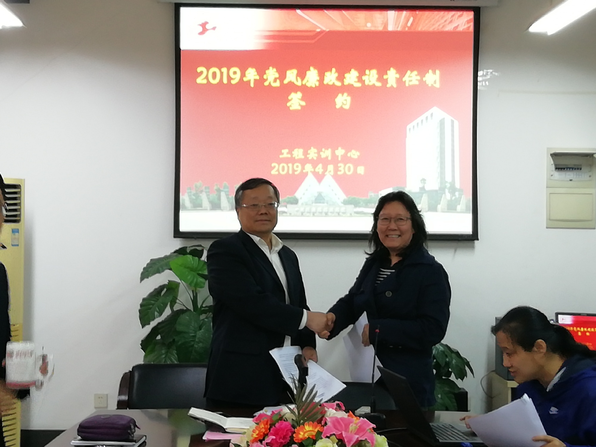 徐新成分别与中心副主任余粟、朱建军及中心各党支部书记和室部主任签署了“工程实训中心党风廉政建设责任书”。