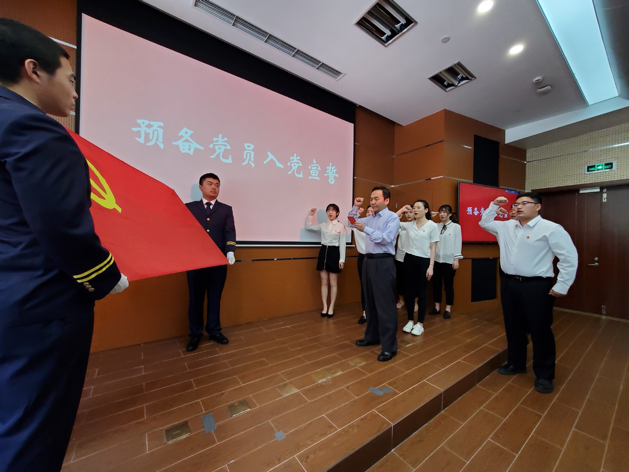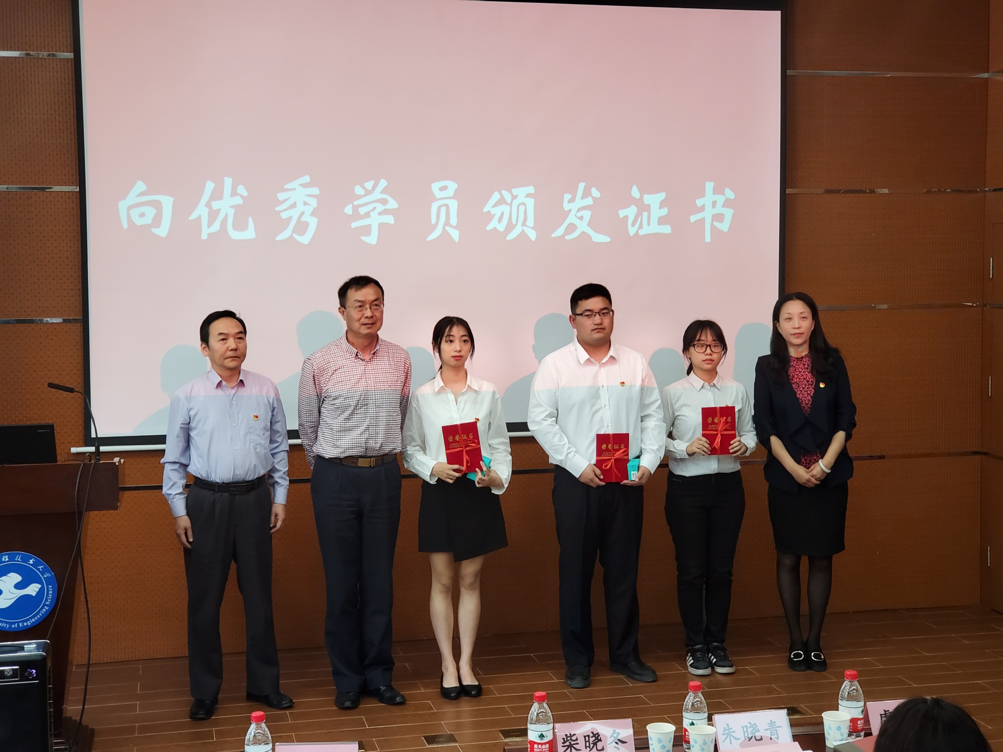 会上,本期预备党员培训班的学员们将对党和祖国的热爱融入诗歌朗诵《做新时代奋进者》中,体现新时代青年一颗积极向上的心。积极分子培训班的学员们用歌声《歌唱祖国》展现浓浓爱国情怀。接着,本期党校轮值书记虞蓉老师介绍党校教学点情况。校党委组织员熊伟老师宣读党的基础知识和预备党员培训班优秀学员名单,并由各学院党总支书记向优秀学员颁发荣誉证书和纪念品。