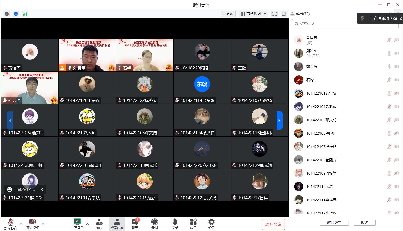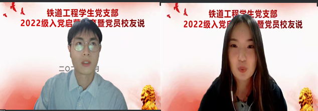 三位特邀党员校友现身说法,铁道工程专业2017级郁万浩,2018级杨昭、王欣分别就入党前后的学习和成长经历与同学们进行了分享,引导同学们积极参加各类实践活动,不断成长进步,坚定跟党走的信念。