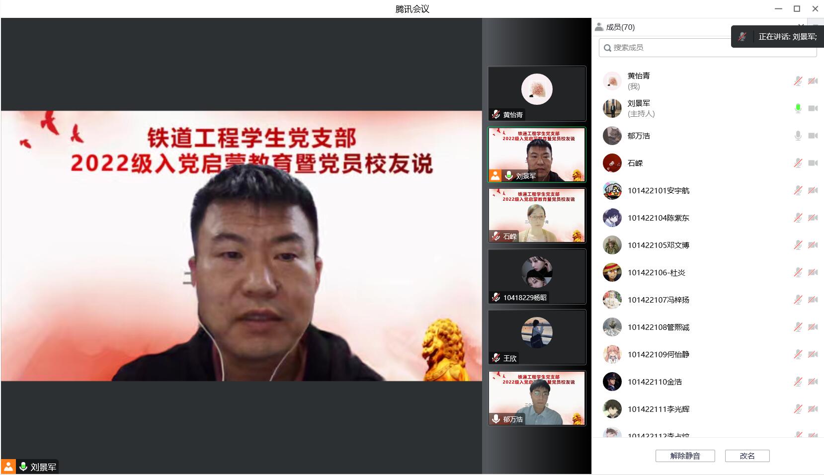在喜迎党的二十大胜利召开之际,10月14日,城市轨道交通学院铁道工程学生党支部2022级新生入党启蒙教育暨党员校友说活动顺利举行。铁道工程学生党支部全体党员、特邀党员校友代表和铁道工程专业2022级全体新生参加活动。入党启蒙教育由党支部书记刘景军主持。