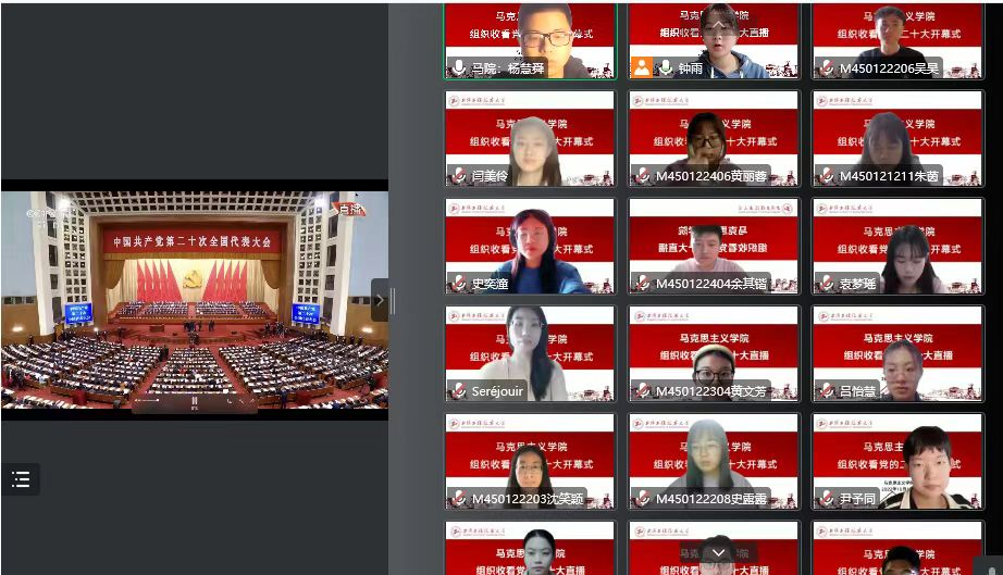 10月16日上午10时,中国共产党第二十次全国代表大会在人民大会堂隆重开幕,马克思主义学院全体师生观看了直播盛况,认真聆听学习习近平总书记代表第十九届中央委员会向大会作的报告。师生们为新时代十年所取得的举世瞩目的重大成就而欢欣鼓舞,表示要不断深入学习、领会报告精神,以昂扬的姿态、饱满的热情、十足的干劲、踔厉奋发,笃力前行。