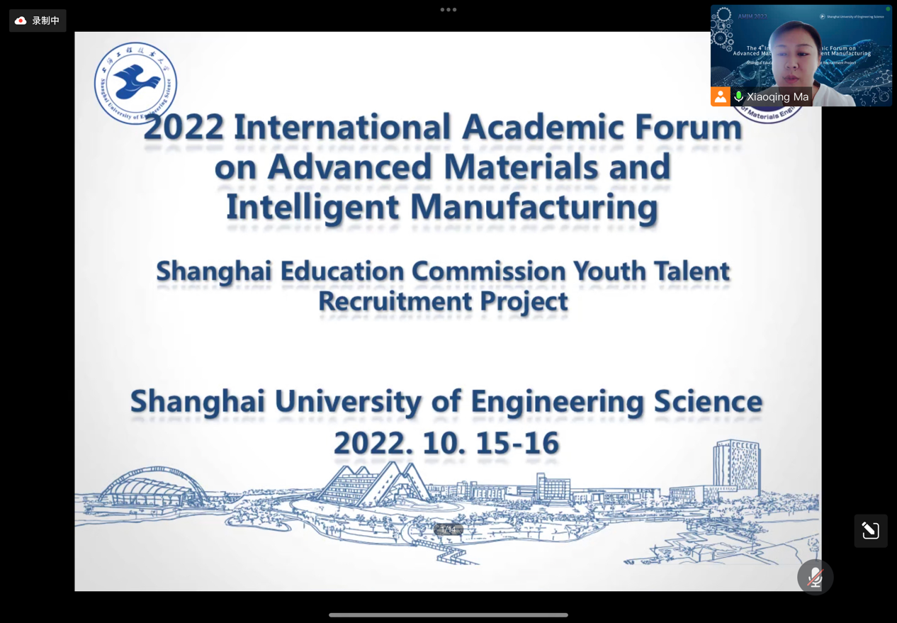 10月15至16日,依托上海市教育委员会青年英才揽蓄工程,由上海工程技术大学主办,上海工程技术大学材料科学与工程学院、人事处和国际合作与交流处共同承办,纺织服装学院和化学化工学院协办的第四届先进材料及智能制造国际学术论坛(The 4th International Academic Forum on Advanced Materials and Intelligent Manufacturing,AMIM 2022)在我校举行。
