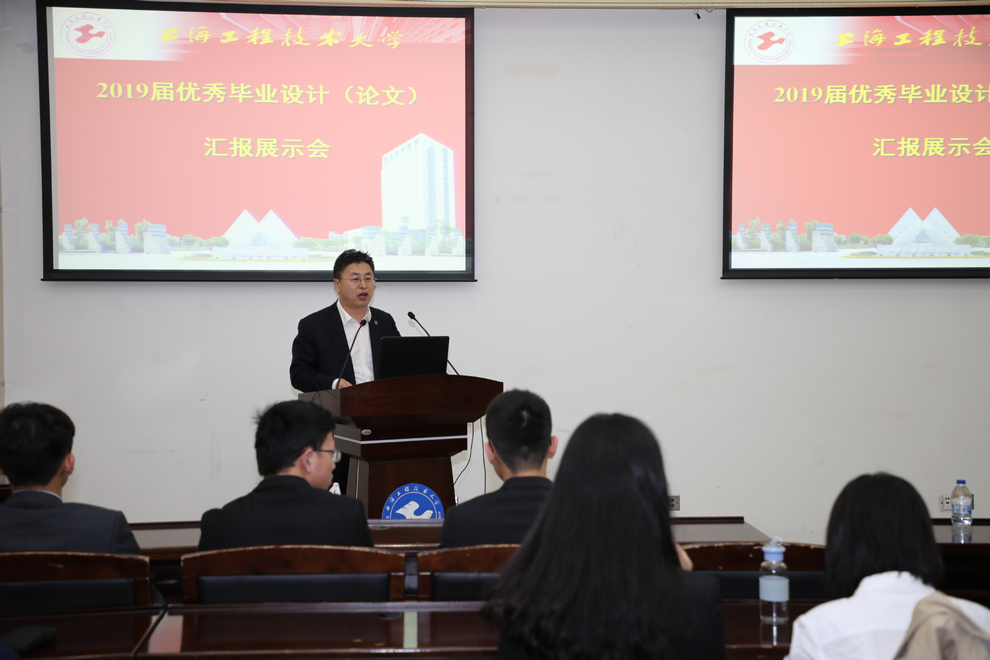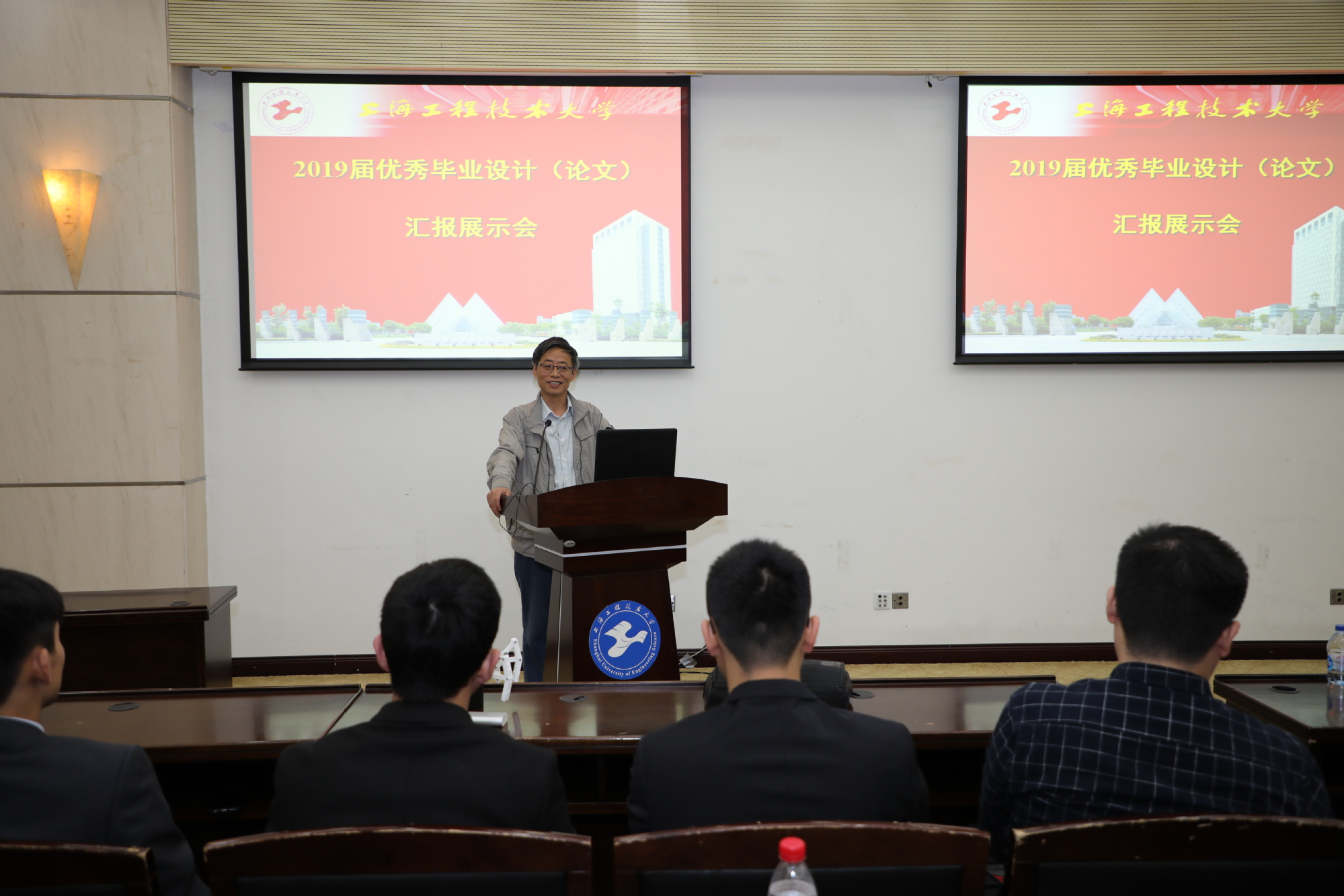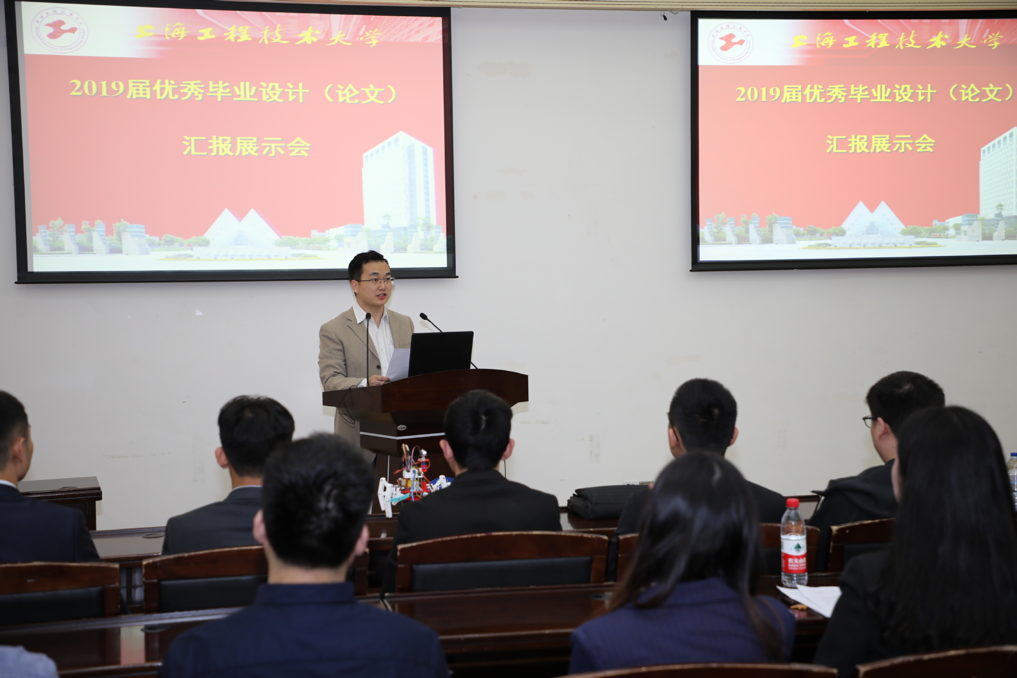 教务处处长陈浩介绍了2019届松江校区毕业设计(论文)概况,王岩松副校长宣布了本届优秀毕业设计(论文)评审组专家名单。按照“上海工程技术大学本科优秀毕业设计(论文)评选办法”,各学院共推荐出75名学生入围本届优秀毕业设计(论文),并从中择优评选出24名学生参加汇报展示。学生分成工科组和管理艺术组同时进行展示汇报,他们依次走上演讲席向评审组专家及师生们汇报了毕业设计(论文)的总体思路、主要工作内容和创新点。学生汇报结束后,曹阳根教授、刘牧众教授分别代表工科组、管理艺术组评审专家对本届优秀毕业设计(论文)的汇报进行了精彩的点评。评审组专家当场评出了一等奖12名、二等奖12名,另有51名学生获得三等奖。