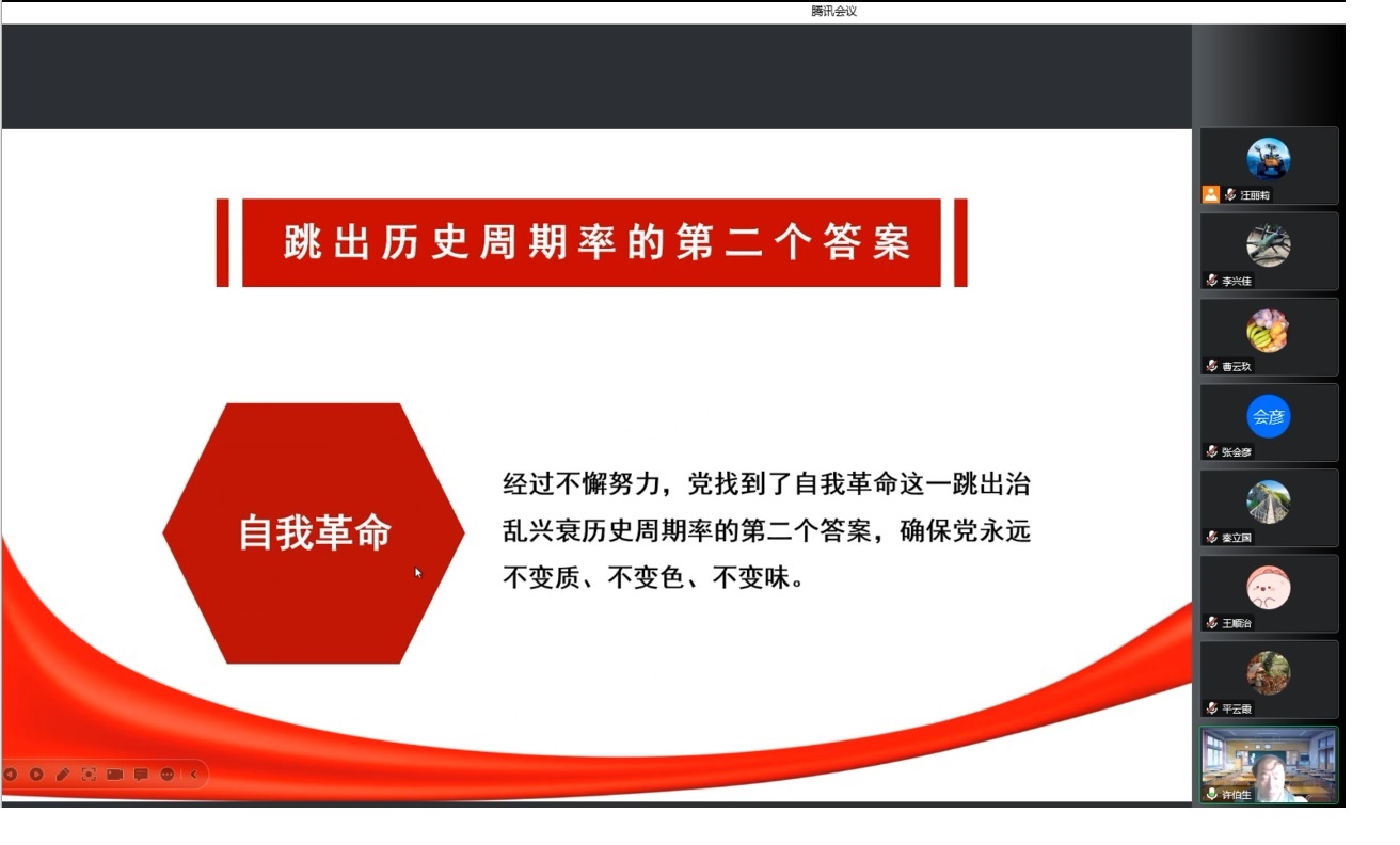 教工第六党支部和大学物理系、光电物理系的全体教师通过腾讯会议线上学习党的二十大精神。学院党委副书记许伯生主讲专题党课,从三个务必、三件大事、跳出周期率的第二个答案、归根到底是两个“行”、党的中心任务等十几个方面对党的二十大报告进行了详细讲解。党课后,支部党员和系部教师交流讨论学习心得。支部书记汪丽莉老师认为,中华民族伟大复兴进入关键时期,需要应对的风险和挑战、需要解决的矛盾和问题比以往更加错综复杂。所以广大党员干部要以模范典型为标杆,坚定教师职责,坚守高尚师德师风,以模范担当建功新时代。