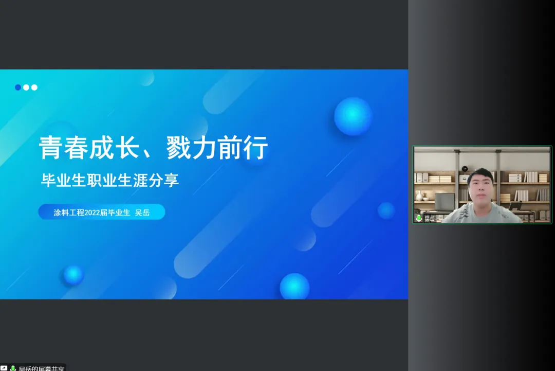 化学化工学院22届毕业生谢昇琪和吴岳进行职业生涯分享。谢昇琪毕业于药物化学专业,中共党员,曾任学院团委副书记,现从事临床研发工作。吴岳毕业于涂料工程专业,中共党员,曾任学院团委学生会主席团成员,现入职延锋彼欧汽车外饰系统有限公司,任汽车尾门项目制造工艺工程师一职。