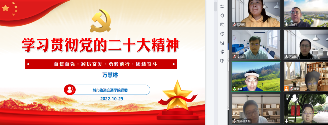 10月29日,城市轨道交通学院党委中心组在线召开学习会,深入学习党的二十大精神,学院党委中心组成员、教师代表参加了会议。会议由学院党委书记万慧琳主持。