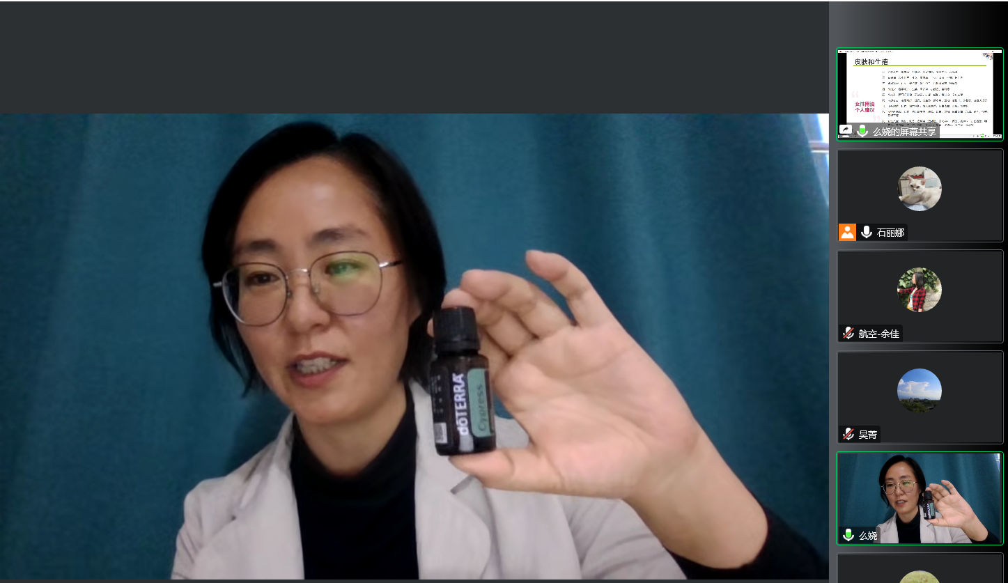 活动伊始,么娆老师为大家讲解芳香精油的历史、种类和使用方法。通过切身的经历重点讲解了芳香精油在生活中的应用,对人体的保健作用,最后还展示了不同种类精油的使用要点和手法。尽管活动采用线上形式,参与的老师依然表现出极大的兴趣和热情,互动环节非常热烈。