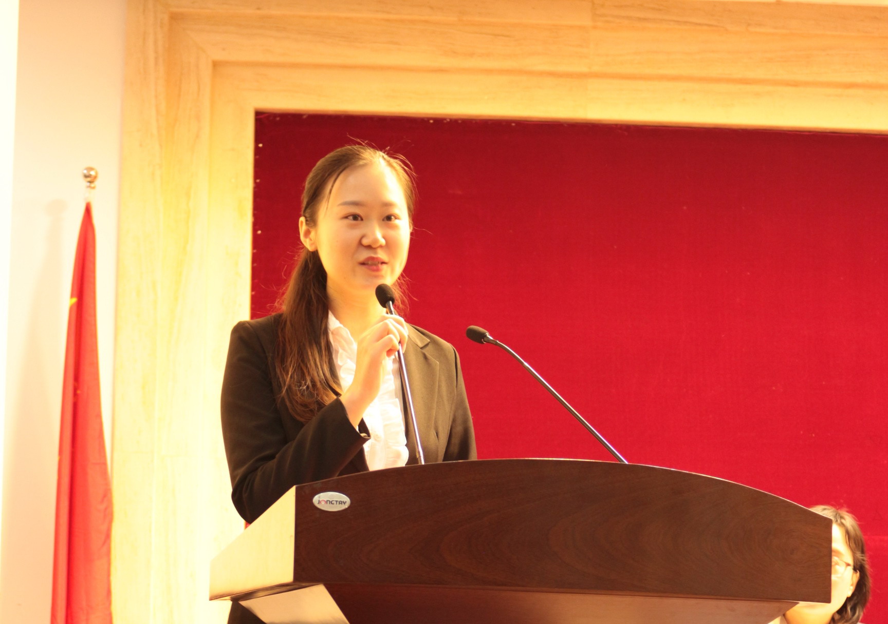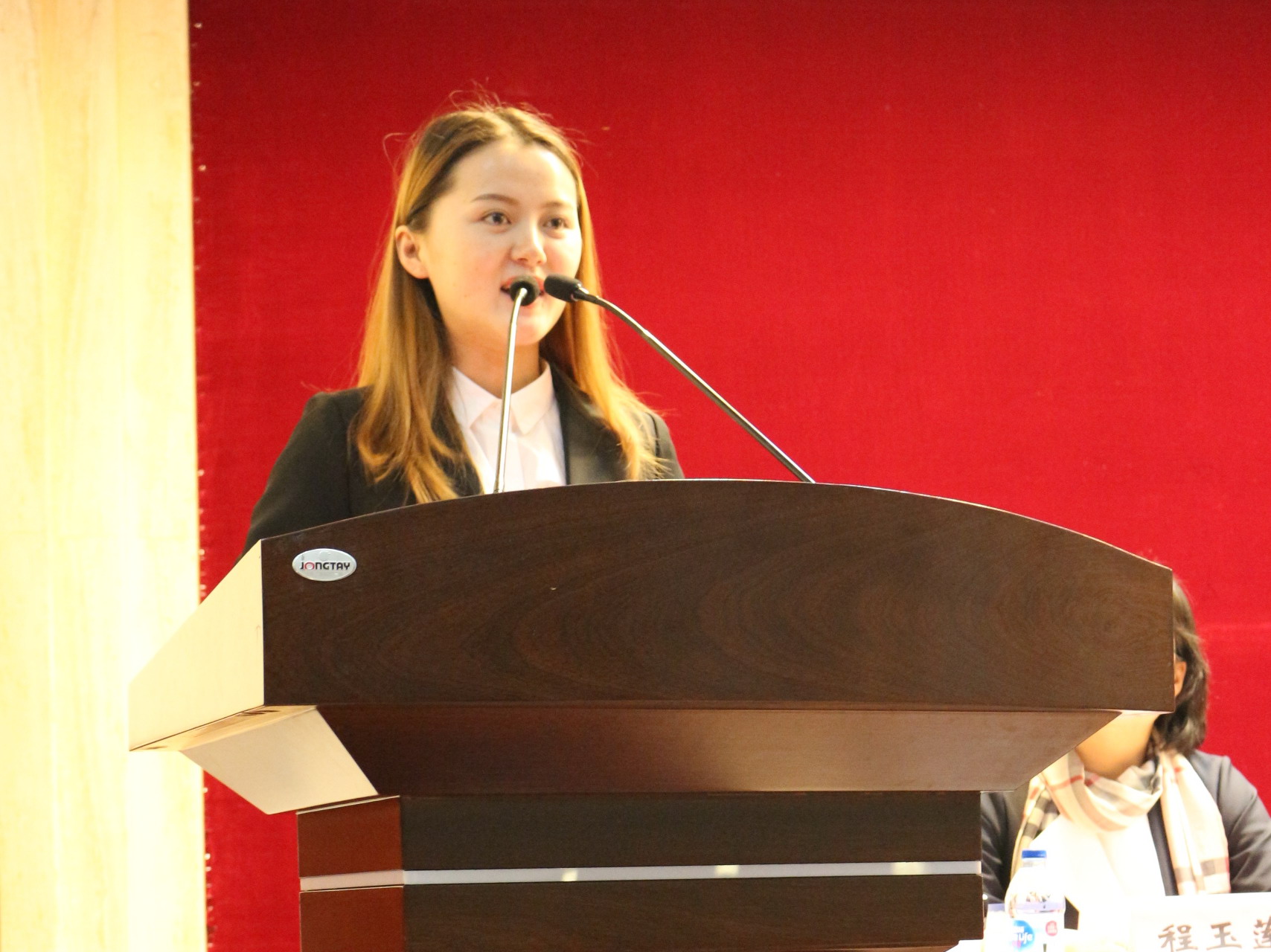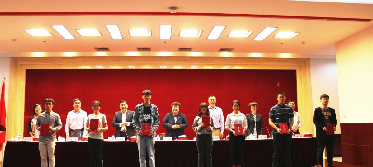 随后,颁奖嘉宾向获奖同学代表颁发了获奖证书并合影留恋。来自2017级工商管理专业的本科生刘春作为“宏毅”奖学金获奖同学代表做了发言,她从“感恩”“幸运”“回馈”三个维度来表达自己对此次获奖的感受,并表示将今天的荣耀化作今后不竭的动力,倡导同学们敢于付出、勇于奉献、保持热情,向下一个目标勇敢进发,取得更加优异的成绩!来自2017级社会保障专业的研究生张贝作为“金罗店”奖学金获奖同学代表做了发言,她介绍了自己在大学的所学、所获、所思、所得,突出学科竞赛、课题参与、社会实践等方面取得的成绩,感谢学校及全体老师的辛勤培育,感谢金罗店开发有限公司对同学们的鼓励与支持。