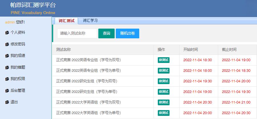 竞赛秉承“了解词汇水平,重视词汇积累,突破学习瓶颈,树立学习信心”的宗旨,分大学英语、研究生和英语专业三个组别进行,各设一等奖、二等奖、三等奖和优胜奖。经过公平、公正、科学、规范的在线测试,参赛者充分发挥自己的水平,赛出了风采,赛出了成绩。近期主办团队将公布成绩。