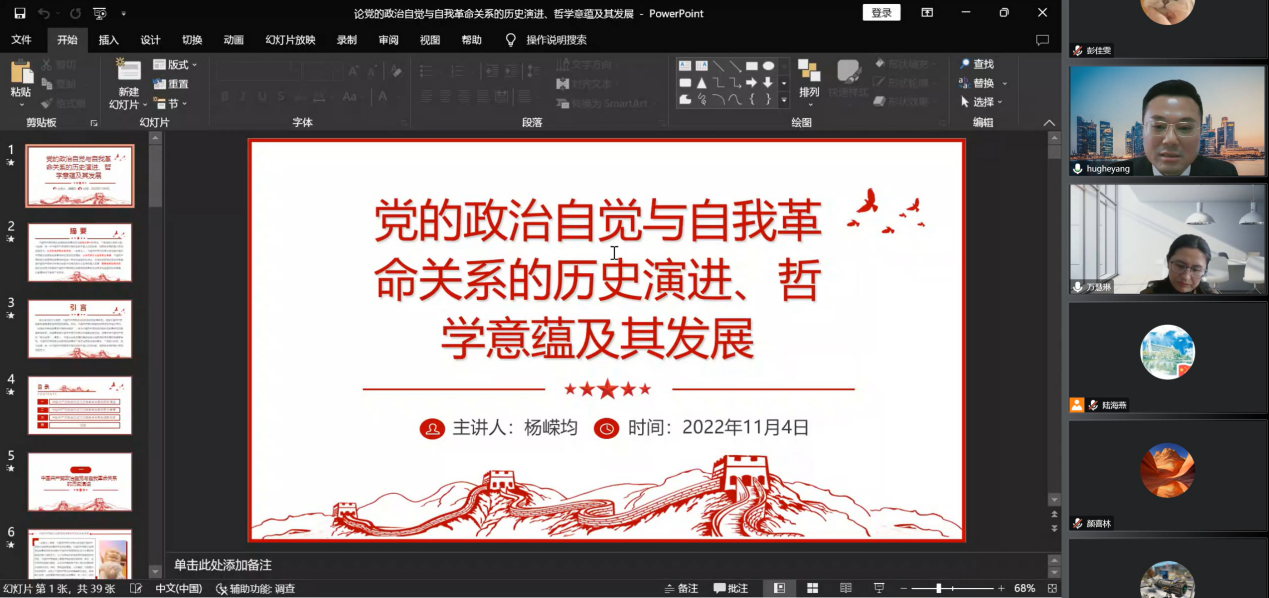 习近平总书记在党的二十大报告中强调,必须持之以恒推进全面从严治党,深入推进新时代党的建设新的伟大工程,以党的自我革命引领社会革命。为学习贯彻党的二十大精神,深刻理解党的百年奋斗历程。11月4日,城市轨道交通学院在线举行教职工政治理论学习会暨2022年党支部书记培训班专题党课,特邀华东政法大学马克思主义学院杨嵘均教授作《党的政治自觉与自我革命关系的历史演进、哲学意蕴及其发展》的专题讲座。城市轨道交通学院全体教职工、2022年党支部书记培训班全体学员参加会议。讲座由学院党委书记万慧琳主持。