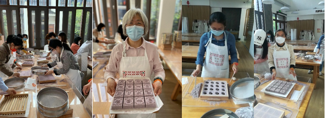 “叶榭软糕”是上海米糕的起源,始于明万历年间,2011年被列为上海非物质文化遗产,当前更成为“上海味道”的代表,是不少松江人走亲访友必备的伴手礼。在“八十八亩田”欢乐体验场,将活字印刷和叶榭软糕完美结合,赋予软糕更多美好的寓意和乐趣。在聚精会神地听完讲解后,大家都跃跃欲试。在老师傅们的悉心指导下,大家挑选模具、筛粉、点坑、挤馅、铺面、脱模,并将制作好的软糕送入蒸锅,一盒盒热气腾腾的软糕新鲜出炉,百年的悠悠余味,便藏于这方寸之间。