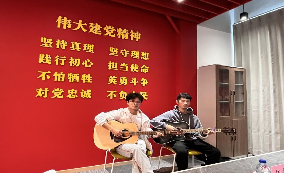 来自材料科学与工程学院的艾孜哈尔•玉素甫和电子电气工程学院的伍枭雄带来了一首特别的吉他弹唱《祖国•稻香》。在愉快轻松的氛围中,本次少数民族新生座谈会圆满结束。