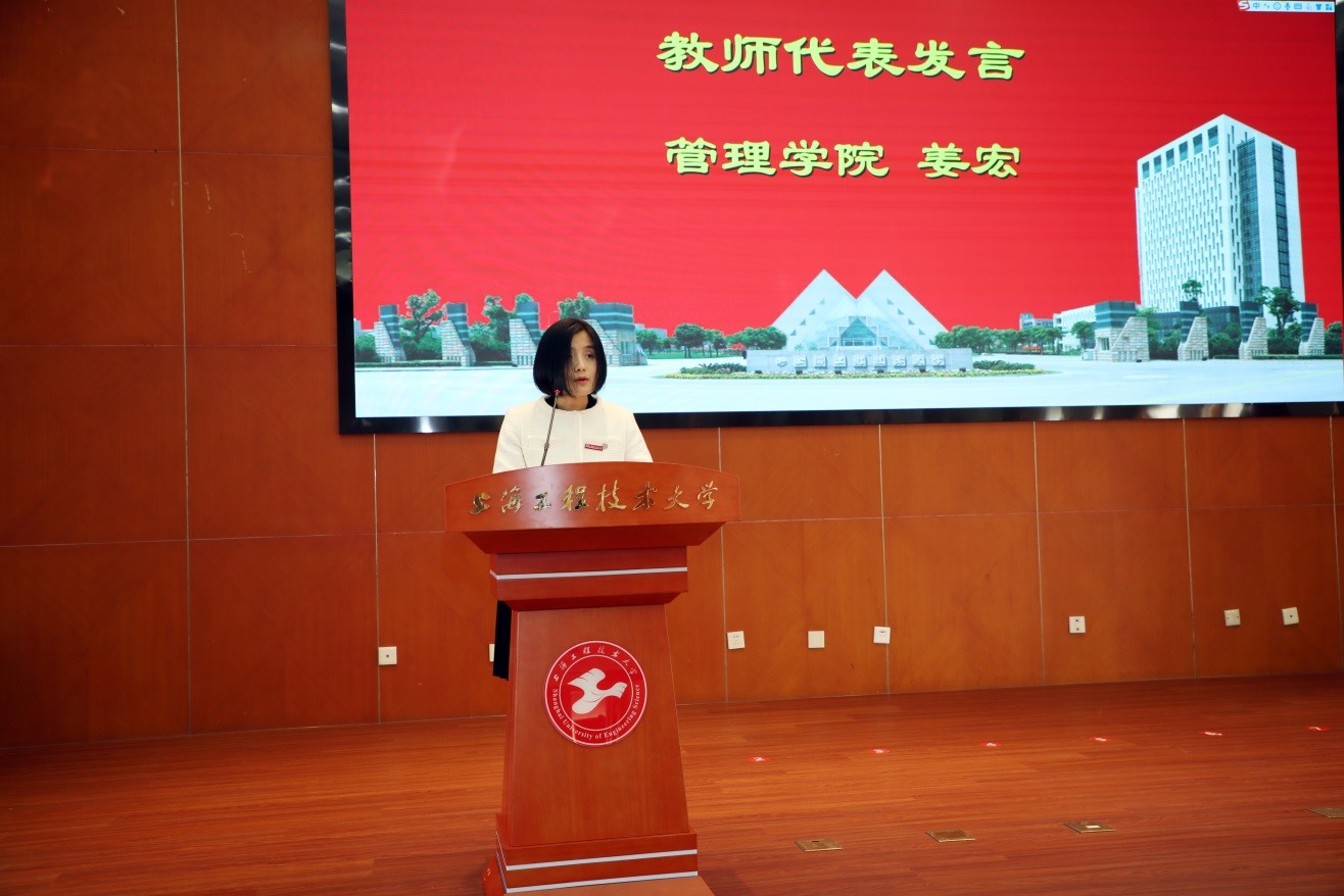 管理学院姜宏老师作为优秀青年教师代表发言,她分享了培训的收获与体会,表示作为一名新入职教师,应该坚持教书和育人相统一,坚持言传和身教相统一,坚持潜心问道和关注社会相统一,坚持学术自由和学术规范相统一;教师要做学生锤炼品格的引路人,做学生学习知识的引路人,做学生创新思维的引路人,做学生奉献祖国的引路人。