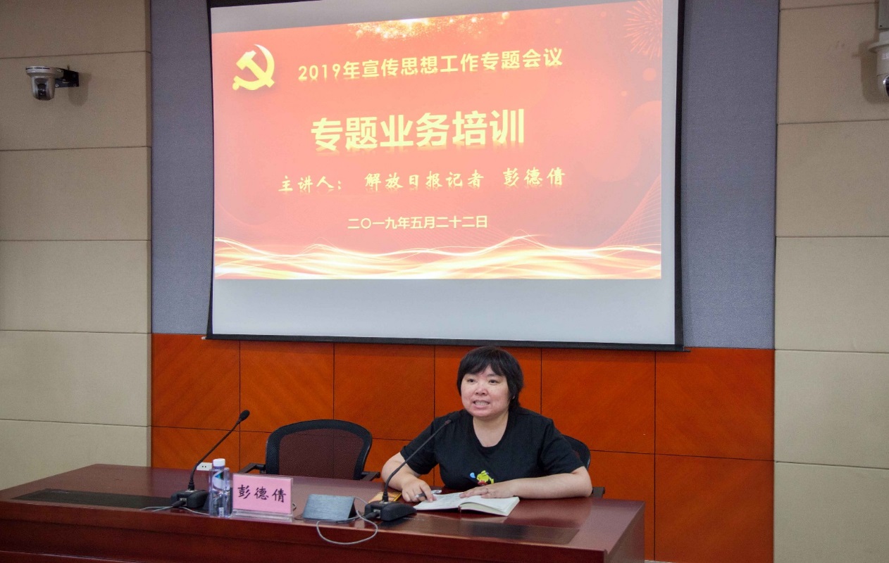 专题会议第二部分,解放日报科教体卫部记者彭德倩作新闻采访和写作专题培训。专题培训从新闻采写的现状入手,深刻剖析新闻采写向透明、多元、快速、融合的创新转型过程。彭老师用精简干练的语言阐述时间明确、内容准确及数字应用对新闻写作的关键所在,介绍采访工作要从独特的人物经历、时间等新闻元素中获取有价值的新闻线索,以有故事、有温度、有感情进行新闻筛选并选取合适的新闻素材方面做了经验交流分享。