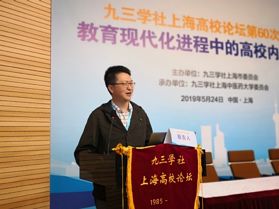 九三学社上海高校论坛第60次会议今天在上海中医药大学举行。本次论坛的主题是“教育现代化进程中的高校内涵建设”。来自上海18所高校的九三学社社员围绕这一主题进行了研讨。九三学社中央委员、九三学社上海市委员会副主任委员,全国政协委员,华东理工大学副校长钱锋院士出席并讲话,上海中医药大学党委书记曹锡康到会祝贺;上海市教育科学研究院院长桑标、市教卫党委统战处处长王瑞杰到会祝贺;九三学社市委副主委吴健生、秘书长朱红出席。高校论坛各成员单位统战部门领导人、社员代表百余人参加会议。我校九三学社委员会徐滕岗、潘健民、杨国平、夏超文和统战部戴宣言参加了会议。