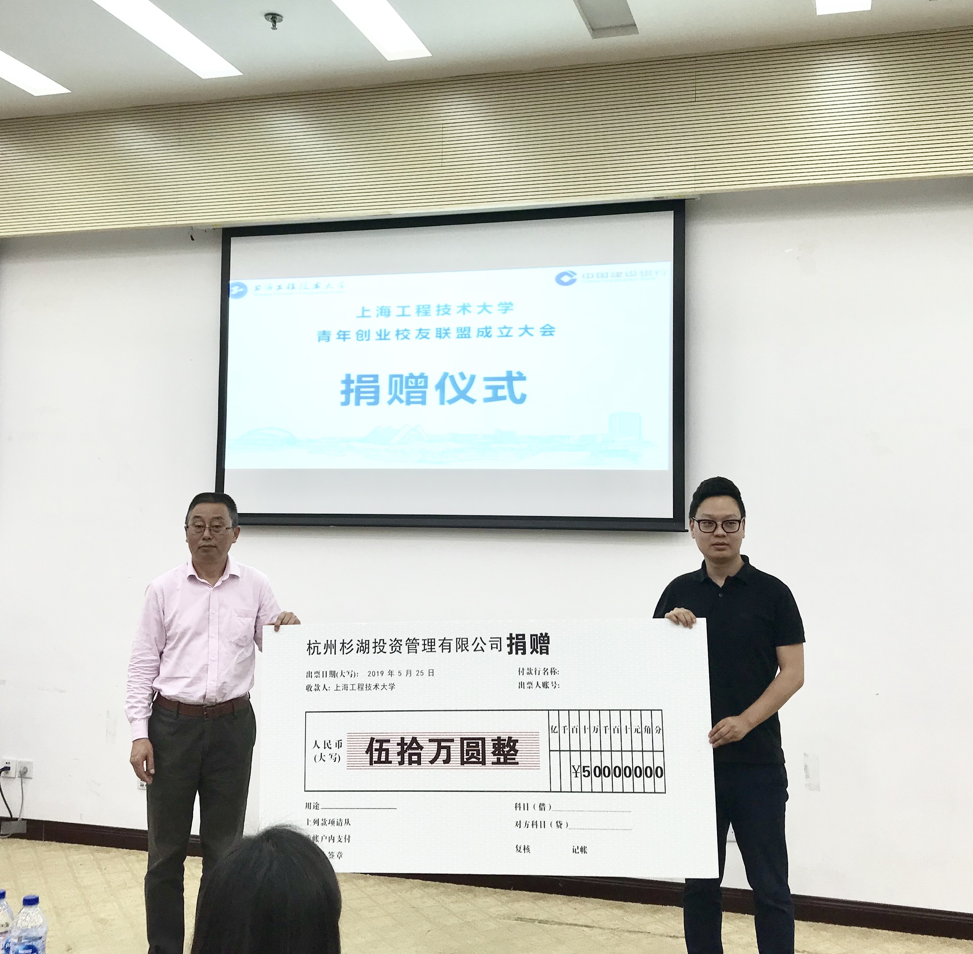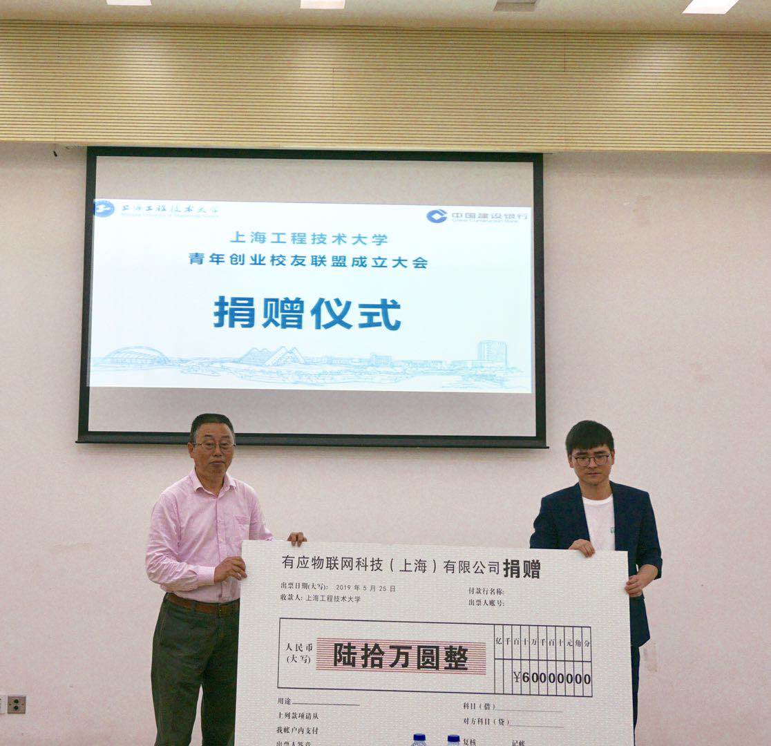 为了感恩母校培养,支持母校发展,活动现场,两位创业校友向母校进行捐赠仪式。杉湖资本创始人、管理学院创业校友胡杉向母校捐赠50万元人民币。有应物联网科技(上海)有限公司创始人、航空运输飞行学院创业校友杨中魁向向母校捐赠60万元人民币。