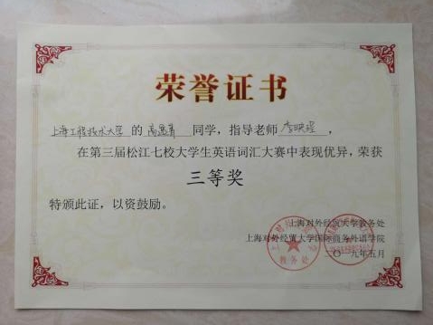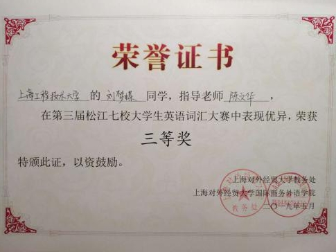 5月24日下午,在上海对外经贸大学图文信息中心举办的第三届松江七校大学生词汇大赛上,我校两位选手获得了三等奖。