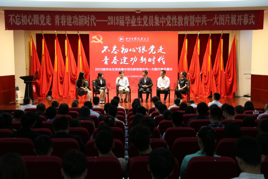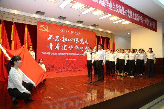 党委常委、党委组织部部长朱洪春带领2019届毕业生党员重温入党誓词,面对党旗,全体毕业生党员庄严宣誓,立志在新的人生起点更加奋发进取。