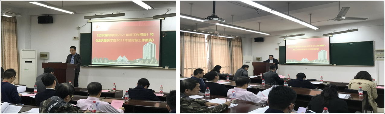 会议在高昂雄壮的国歌声中正式开幕,院党委副书记谢志霞同志通报了二级教代会代表民主评议院领导班子和班子成员的情况,院长辛斌杰同志作了《纺织服装学院2021年度工作报告》和《纺织服装学院2021年度财务工作报告》,院工会主席王黎明同志作《2021年度纺织服装学院工会工作报告》和工会经费使用情况的说明。